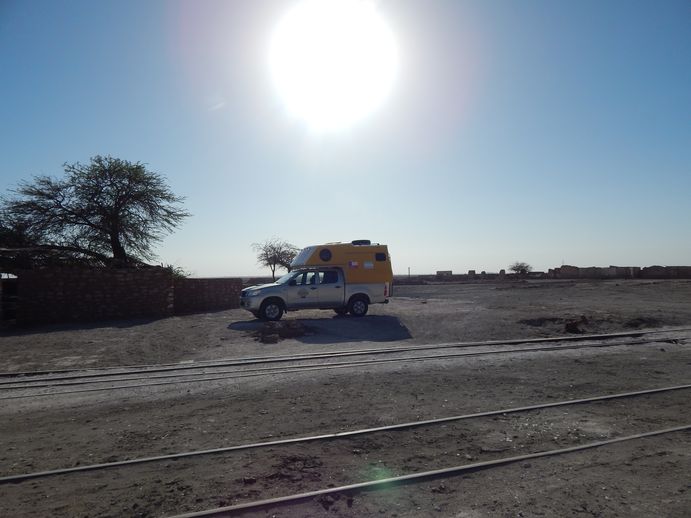 Wir haben gut geschlafen und freuen uns immer noch über den schönen Übernachtungsplatz, den wir gefunden haben. Nach einem reichhaltigen Frühstück aus Spiegeleiern und Brot brechen wir auf zunächst Richtung Norden um dann nach Osten in die Berge abzubiegen. Ziel ist der Nationalpark Pampa del Tamarugal, dort soll es die größte Ansammlung von Geoglyphen zu bestaunen geben. Wir nehmen den Abzweig in Patillos nach Osten. Zunächst über Asphalt, dann über ziemlich schlechte Schotterpiste erreichen wir den Nationalpark, der sich dadurch auszeichnet, dass hier Bäume wachsen sollen....nunja, hin und wieder sieht man tatsächlich eine trockenes, ziemlich armselig aussehendes Bäumchen in ansonsten ziemlich öder wüster Pläne....wir finden die Piste zu den Geoglyphen, welche an einem alten verlassenen Geisterbahnhof vorbeiführt. Der wiederum sieht aus wie in einem alten Westernfilm.