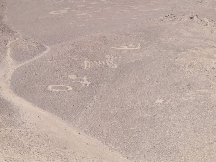 Also weiter bis an das verlassene Visitorcenter. Die Geoglyphen sind ganz interessant. Wie diskutieren hin und her, was die Zeichen wohl bedeuten mögen: Hund geht runter? Vogel sitzt auf Stein? Frau tanzt im Kreis? Alter Mann setzt Hut auf? Raumschiffe hier landen? Wie dem auch sei, da hatte jemand ganz, ganz viel Zeit....