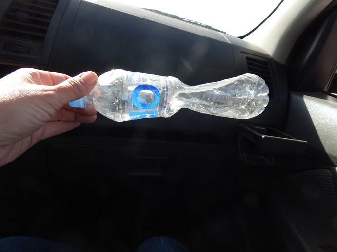 Wir verlassen den See und gelangen über Asphalt (ja, man kann es auch einfacher haben, aber für Einfach sind wir ja nicht hier) wieder in deutlich niedrigere Höhen - und stellen fest, dass sich eine kleine PET-Flasche prima als Höhenmesser eignet. Auf Höhe ausgetrunken und zugedreht zieht sie sich mit abnehmenden Höhenmetern zusammen. Sie dient uns auch die nächsten Tage noch zuverlässig zur Abschätzung der Höhe.
