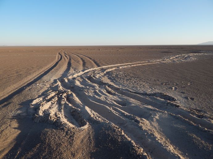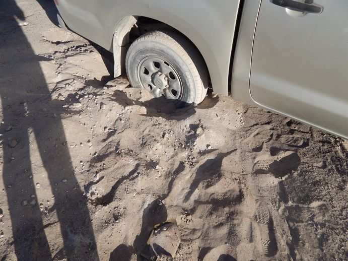 Nach dem üblichen Frühstück brechen wir auf gen San Pedro, um uns einen Campingplatz zu suchen. Wir müssen ein wenig "Service" am Auto betreiben. Wir wollen den Reifen wechseln, der von Anfang an einen Riss hatte, weil dieser Riss sich unter dem niedrigen Luftdruck hier doch gefährlich ausbeult. Außerdem müssen wir unseren Wassertank füllen und eine anschließende Dusche wäre auch nicht schlecht. Es ist noch früh am Morgen,mal sehen, ob die Campingplätze ihre Tore schon geöffnet haben.