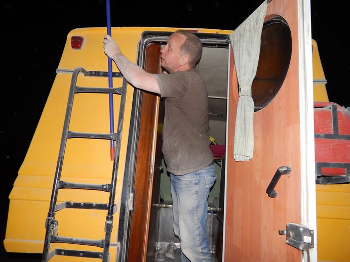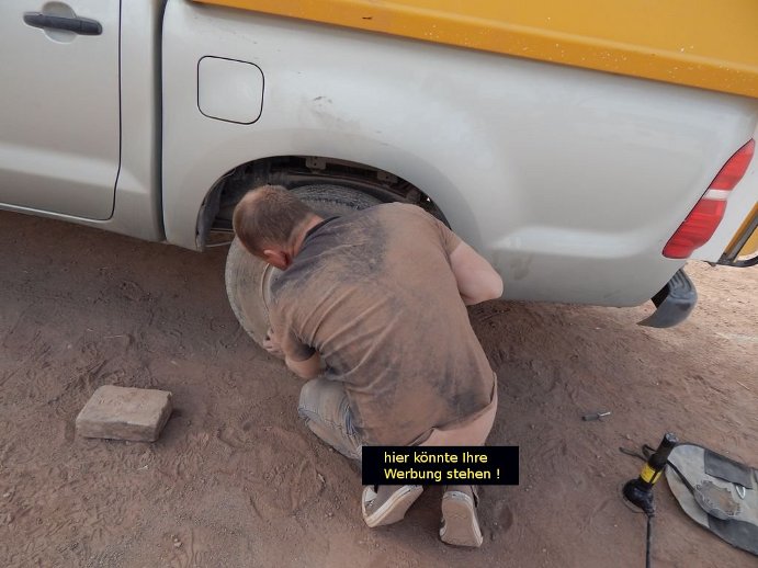 3 Stunden später sind alle Steine im Umkreis von 1000m abgesammelt, von den durchdrehenden Reifen in 5m Tiefe in den Sand eingebuddelt und wir ca. 10m weiter gekommen....wir sind komplett eingesandet und eingestaubt und ich bin kurz davor aufzugeben, zumal die Sonne untergeht. Mein Plan: Schlafen und morgen Baufahrzeug - Fahrer um Hilfe bitten, nur ca. 1km weit weg sind wir an einer Baustelle vorbei gekommen. Jochens Plan: ein letzter Versuch, aber DU musst ORDENTLICH schieben!! Gesagt, getan. Ich schiebe, Jochen kämpft und - oh Wunder - wir schaffen es auf ein festes Stück Piste !! Uff....Wir sehen aus wie paniert, aber Hauptsache frei! Wir weihen unser Dusche ein. Mit kaltem Wasser, weil wir noch nicht herausgefunden haben, wie der Durchlauferhitzer funktioniert. Hinterher fühlen wir uns wie neugeboren, das Bier schmeckt doppelt so gut und zu Essen gibt es heute nur Brot, zum Kochen haben wir keine Lust mehr....Schlafen.