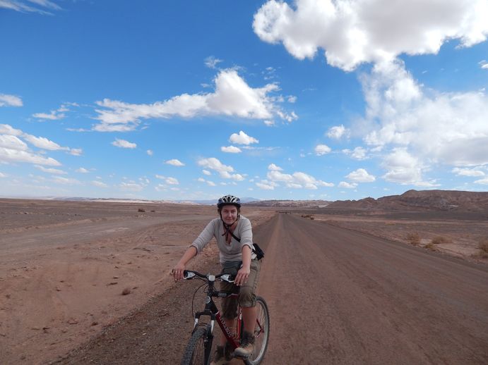 Jochen ist begeistert, weil er mit Helmen immer so bescheuert aussieht. Wir nehmen also die Räder, Helme, Ersatzschläuche, Werkzeug, Schlösser und allerlei anderen Krimskrams entgegen (der Rucksack wird immer schwerer), kaufen Wasser (der Rucksack wird noch schwerer) und machen uns auf den Weg ins Valle de Laluna. Nach 5km geht uns gut trainierten Vollprofis die Puste aus. Berg rauf, Berg runter und das auf 2450m Höhe, das hat es schon in sich. Trotzdem schaffen wir es bis ins Valle de la Luna (10km eine Strecke) und schauen uns am Anfang die "Cuevas" an. Das ist eine schmaler Pfad durch einen Canyon, der teilweise durch sehr schmale Höhlen führt. Zum Glück hat uns der Fahrradonkel schon darauf hingewiesen, dass man sein eigenes Licht mitbringen muss. Also haben wir unser LED-Kopflämpchen eingepackt - stolz, so gut ausgerüstet zu sein.