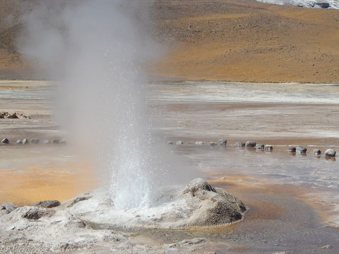 Weiter geht es über die Piste, bis wir nach ca.100km die Geisiere erreichen. Noch merken wir wenig von der dünnen Luft. Wir sind tatsächlich alleine an den Geisieren, die auch zur Mittagszeit faszinierend sind. Überall blubbert und zischt es aus diversen Löchern und Hügelchen. Es liegt Schwefelgeruch in der Luft.