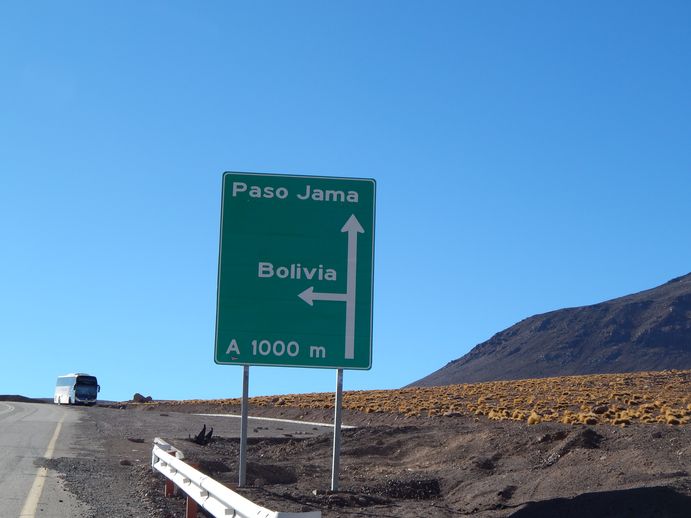Also auf geht's. Laut Reiseführer soll die Ausreise schon in San Pedro erledigt werden. Die Grenzbaracke, welche um 8.00 Uhr öffnen soll, hatten wir vorher in San Pedro schon entdeckt. Die steuern wir als erstes an. Dort teilt uns der Putzmann mit, dass die Grenzformalitäten für Chile und Argentinien direkt am Paso Jama erledigt werden, die Baracke in San Pedro sei nur für Einreise und Ausreise aus bzw. nach Bolivien zuständig. Wir sind etwas verunsichert und haben Sorge, dass wir zum 160km entfernten Paso kommen und man uns dann wieder zurück schickt...wir begeben uns zur Straße, die zum Paso führt. Die ist durch einen Polizeiwagen abgesperrt, vor der Sperrung warten bereits ein paar Busse. Um 8.30 wird die Strasse geöffnet und alles jagt los. Es geht sehr schnell und ziemlich steil hoch. Man erreicht nach ca. 50km den höchsten Punkt der Strecke, die 4800m. Ich „befülle“ unsere Indikatorflasche neu und japse nach Luft. Wobei wahrscheinlich viel davon Einbildung ist, die Japserei hört bald auf und Jochen merkt gar nichts, ihm geht’s wunderbar. Landschaftlich ist die Strecke recht hübsch, die Strecke zu den Geisieren fand ich persönlich aber deutlich eindrucksvoller.