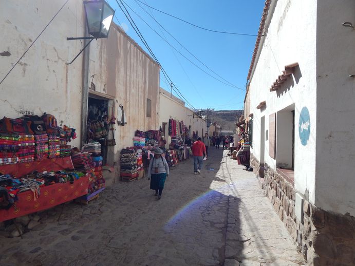 Das kleine Städtchen ist ein Mix aus kolonial und indigen, extrem verschlafen und sehr auf Tourismus ausgelegt. Wir suchen uns erst mal einen Campingplatz, es gibt zum Glück direkt einen am zentralen Platz. Eine Art Hostal, das auch Camping anbieten. Klos sauber, Platz hübsch, hier wollen wir sein. Wir versuchen der Camping-Tante klar zu machen, dass wir noch kein argentinisches Geld haben und sie lässt uns dann doch, wenn auch etwas argwöhnisch, auf den Platz. Jetzt wollen wir in die Stadt!