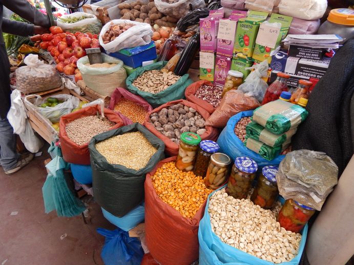 Als wir ankommen, haben zwei Reisebusse ihren Inhalt ausgespuckt. Zentral am Platz haben Einheimische Tische aufgebaut, wo alle das gleiche Sortiment an Mützen, Handschuhen, Tüchern, Ponchos und Bommeln in buntesten Farben anbieten. Um diese Tischchen langweilen sich ein Haufen Touris. Es gibt ein paar kleine Cafes und eine recht hübsche Kirche am Platz. Wir suchen erst mal eine Geldtauscherei und finden eine mit Hilfe einer englisch sprechenden Argentinierin, die sich als sehr hilfsbereit erweist.