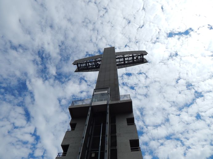 Das Kreuz ist ein riesiges, begehbares Metallgestell – ca. 80m hoch und auf einem Hügel – noch aus 100km Entferung zu sehen. Das Ganze wurde in eine Art Themenpark integriert mit Brilli-Brilli, Schmetterlingshaus und Gewächshaus für exotische Pflanzen. Man wird in einem Trecker mit Hänger auf den Berg gefahren und kann für viel Geld mit dem Lift „Lift to the Sky“ bis hoch auf die "Ausleger" des Kreuzes fahren. Das ist schon sehr hoch und beeindruckend mit herrlichem Blick über die Landschaft. Begleitet werden wir von einer niedlichen jungen Argentinierin, die hervorragend Englisch spricht. Sie arbeite noch nicht so lange hier, erzählt sie uns und verläuft sich prompt. Am Fuß des Kreuzes gibt es diverse Fahrstühle (alle führen zu unterschiedlichen Ebenen) und Treppen. Sie scheucht uns erst mal einige Treppen rauf und runter , bis sie den richtigen "Lift to the Sky" findet, der uns die 80m nach oben bringt. "Oh, I'm lost" murmelt sie verlegen.
