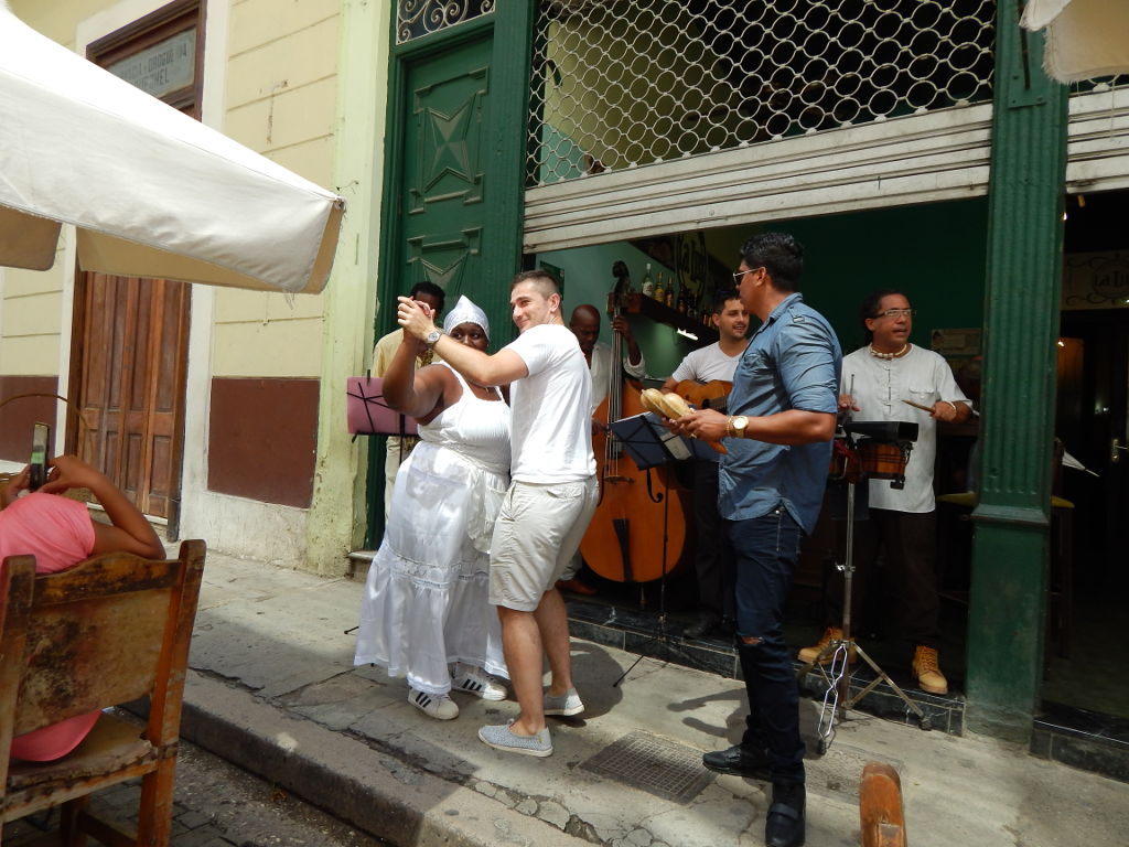Alexandro hat uns für den Abend einen Tisch bei der "Sociedad Cultural Rosalia de Castro" reserviert. Hier gibt es ein Dinner mit "Buena Vista Social Club" feeling. Wir sind etwas zu früh, Einlass ist erst ab 20:30Uhr. Zum Glück gibt es nebenan eine Bar, in der wir uns einen Mojito genehmigen können. Auch ein "Musiker" ist vor Ort, sein Instrument besteht aus einer Holzlatte, einem Eimer und einem Stück Wäscheleine als Saite. Barbara darf darauf "Smoke on the Water" zum besten geben.