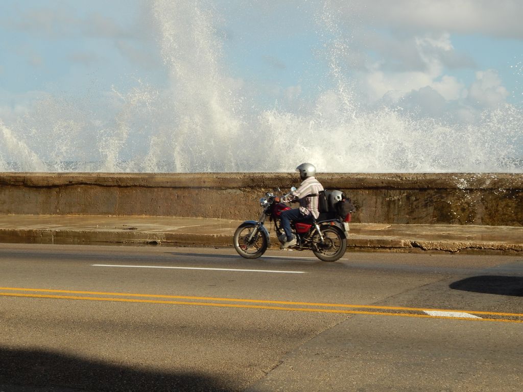 Um 3 Uhr Morgens weckt uns ein Hahn – mitten in der Großstadt! Wir fühlen uns spontan an zuhause erinnert und schlafen schnell wieder ein. Nach dem leckeren Frühstück mit hausgemachter Marmelade, frischem Obst und frisch gepresstem Saft machen wir uns auf zur ersten Stadtbesichtigung. Mit der Altstadt – La Habana Veja – fangen wir an. Da wir in Centro Habana wohnen, ist diese fußläufig erreichbar. Die legendäre Uferpromenade - der Maleón ist auch nur 3 Strassen entfernt. Wir bestaunen die Wellen, die auf die Strasse spritzen und können uns gut vorstellen, wie es wohl aussieht, wenn ein Hurrikan das Wasser in die Stadt treibt.