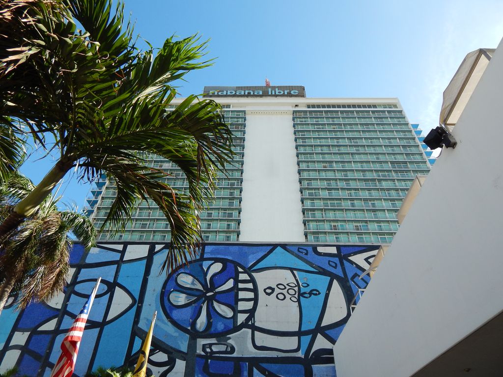 Wir können jetzt durch den Zoll und unser Abholer wartet bereits. Wir werden in ein Taxi gesetzt und Jochen bittet den Taxifahrer, kurz an einer Wechselstube anzuhalten. Auf dem Weg vom Flughafen in die Stadt – es sind ca. 20km – sehen wir kaum Sturmschäden. Der Fahrer stoppt kurz am „Habana Libre“-Hotel und wir wechseln einige Euro in „Konvertible Pesos“ (CUC).