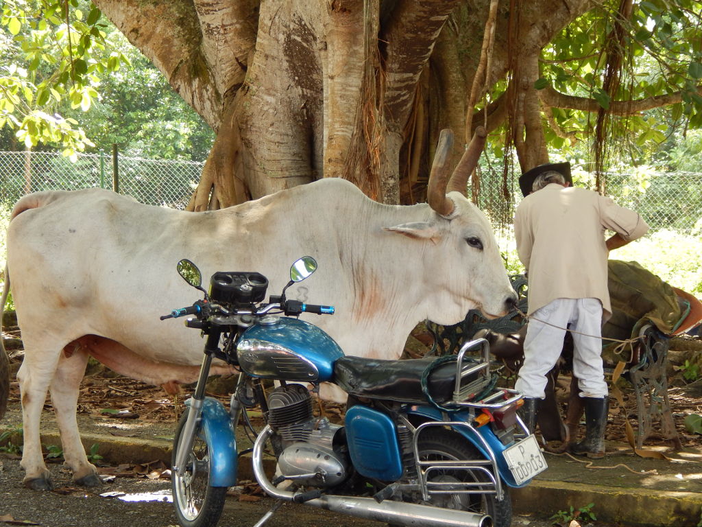 Wir halten an der Cafeteria vor dem Hotel „Los Jazmines“. In diesem Hotel haben wir 2013 übernachtet. Wir laden Rolly zu einem Kaffee ein und geniessen den Ausblick über das Tal mit seinen Kegelfelsen, den Mogotes. Die Landschaft hier ist einzigartig – nicht umsonst wurde sie 1999 von der UNESCO mit dem Titel „Kulturlandschaft der Menschheit“ bedacht.