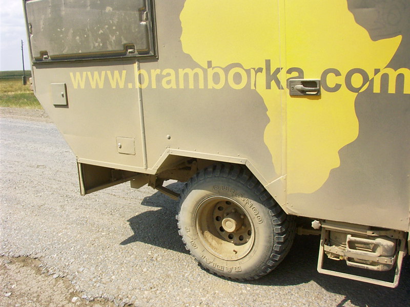 16.06.05 Der Tag beginnt damit, daß Engelchen nicht anspringen will. Die Starterbatterien sind leer. Wie das passieren konnte? Ganz einfach – wir hatten unseren Bordkühlschrank leichtsinnigerweise auf die „Eiswürfelbereitungs-Stufe“ geschaltet. Wir haben zwar Bord- und Starterbatteriekreise streng voneinander getrennt, auch ist der Spannungswandler für das Laden der Bordbatterie auf 20 Ampere strombegrenzt, aber diese 20 Ampere waren vermutlich zuviel für unsere Lichtmaschine. Ergebnis: 250 Gramm tiefgefrorene Butter und nicht genügend Ladung zum starten. Und das mutterseelenallein und mitten in der Steppe. Naja, muß halt das „Backup-System“ herhalten: Bordbatterie ausbauen, ein Starthilfekabel und schwupps läuft die Höhle wieder. Dafür wird die Piste immer schlechter. Engelchen ist von oben bis unten in eine dicke Staubschicht gehüllt. Wo Piste ist, da ist Sie tief und sanding und wo Straße ist, da besteht sie aus extrem tiefen Schlaglöchern. Wir reißen uns den Auspuff ab und einer der Kanisterhalter aus dem Daerr-Versand reißt in der Mitte durch. Jochen behebt die Schäden mit einem Stück Draht. Sand und Staub überall. Dazu das leidige Kupplungsproblem: es wird immer schlimmer. |