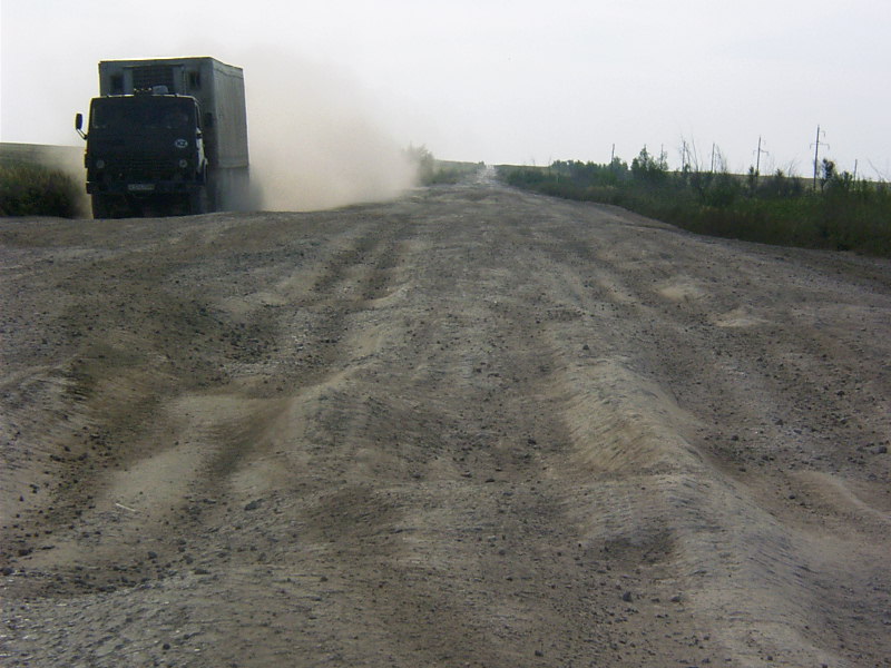 Sehr schnell wird uns das klar: nach ca. 40km sehr guter Landstraße liegt plötzlich ein Haufen Erde auf der Straße – Baustelle. wir fahren auf eine schlechte und rüttelige Piste, die später extrem versandet ist und tiefe LKW-Spuren aufweist. Für Engelchen kein Problem, für PKWs (und einige wenige LADAs haben wir gesehen) eher nicht zu empfehlen. Wir benötigen für die ersten 250km 8 Stunden, schlechteste und rüttelige Baustellenpiste wechselt sich ab mit der allerschlechtesten und rütteligsten Straße dieser Welt. Weitere 220km liegen vor uns und da – wie nicht anders zu erwarten war – auch unsere Kupplung wieder muckert , beschließen wir, es für heute gut sein zu lassen. |