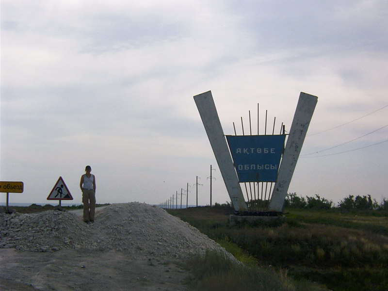 15.06.05 Was für eine Nacht. Um halb zwölf wird plötzlich unsere Zimmertür aufgeschlossen und gleich wieder zugemacht. Ich sitze senkrecht im Bett. „Was soll sein“, murmelt Jochen, „da wird sich einer vom Personal in der Tür geirrt haben.“ Ich kann trotzdem den Rest der nacht kaum schlafen, während der Herr selig weiterschnarcht. Zur Sicherheit schiebe ich unseren Mülleimer vor die Tür, damit wir den Einbrecher beim nächsten Mal hören. Entsprechend unausgeschlafen beginne ich den Tag. Einräumen, Auschecken und ab vom Hof. Jetzt noch schnell ein wenig Wasser und Lebensmittel eingekauft und endlich kann es weitergehen. Denkste – alle 500m eine Polizeikontrolle – zielsicher werden immer wir heraus gewunken und neugierig befragt. Irgendwann hat Jochen die Schnauze voll: „piet (fünf) kilometer, piet kontroll – spinnt Ihr hier total?“. Der Polizist guckt etwas irritiert, will dann aber trotzdem noch mal einen Blick in unser „Mini-Dum“ (=Haus) werfen. Und endlich kann es losgehen nach Aktobe – 470km durch die Steppe. Am Ortsausgang der letzten Ortschaft vor dem Nichts steht ein Englischsprachiges Schild: „Good Luck“. Wie die das wohl meinen? |